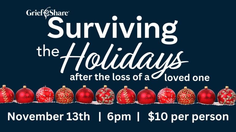 GriefShare: Surviving the Holidays is a one-time session on Monday, Nov 13th, 6pm-8pm at CenterPointe Church, helping individuals navigate the holidays after loss.